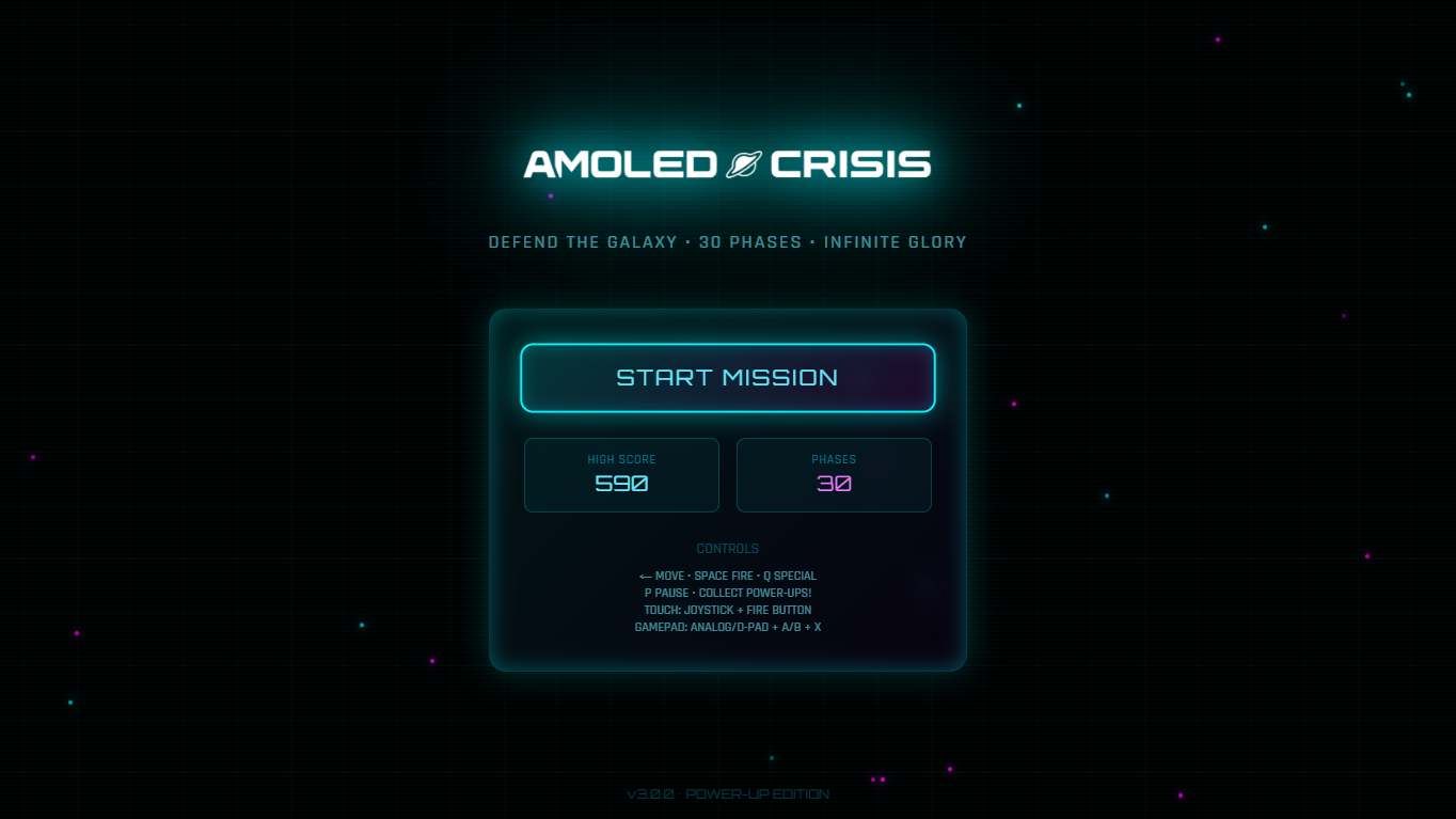 Amoled Crisis is a futuristic arcade shooter inspired by classic space shooters and modern neon aesthetics.